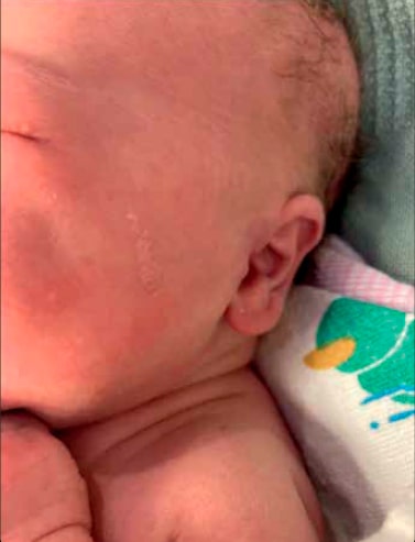 Después de un embarazo sin complicaciones y un parto vaginal espontáneo y de término, se observó una placa de color blanco amarillento en la mejilla del recién nacido (Figura 1). Los resultados de las pruebas de laboratorio fueron normales y no existen antecedentes familiares de padecimientos cutáneos congénitos.